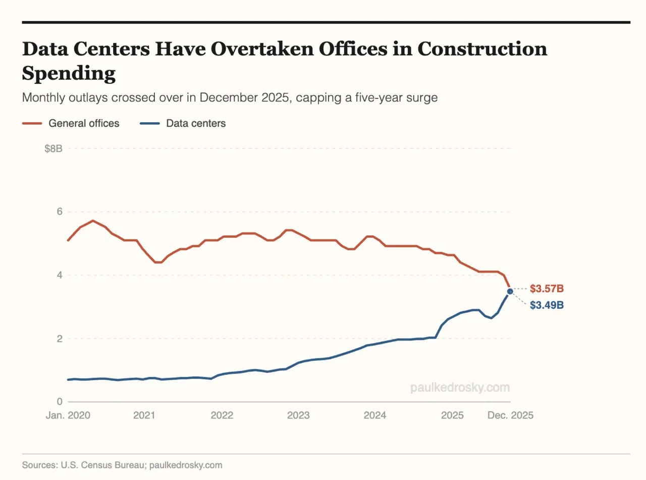 This is tectonic. Those 30,000 workers cost about $8 billion a year. The message is clear – fewer human salaries, more data centers. The amount of money spent on building data centers recently surpassed the amount of money spent on office buildings for the first time.