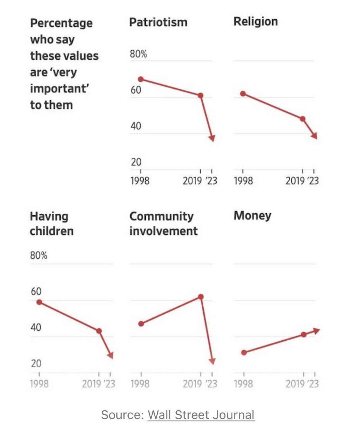 How do we measure how things are going? A recent Wall Street Journal poll gauged what Americans agreed were very important. The results were jarring; Americans have gotten markedly less interested in patriotism, religion, having children, or community involvement.